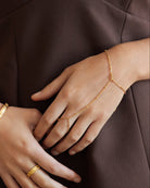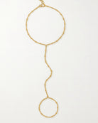 This elegant hand chain bracelet connects your wrist to your finger with a delicate beaded gold chain. Designed for both style and comfort, it’s a modern piece that adds a unique touch to any outfit.