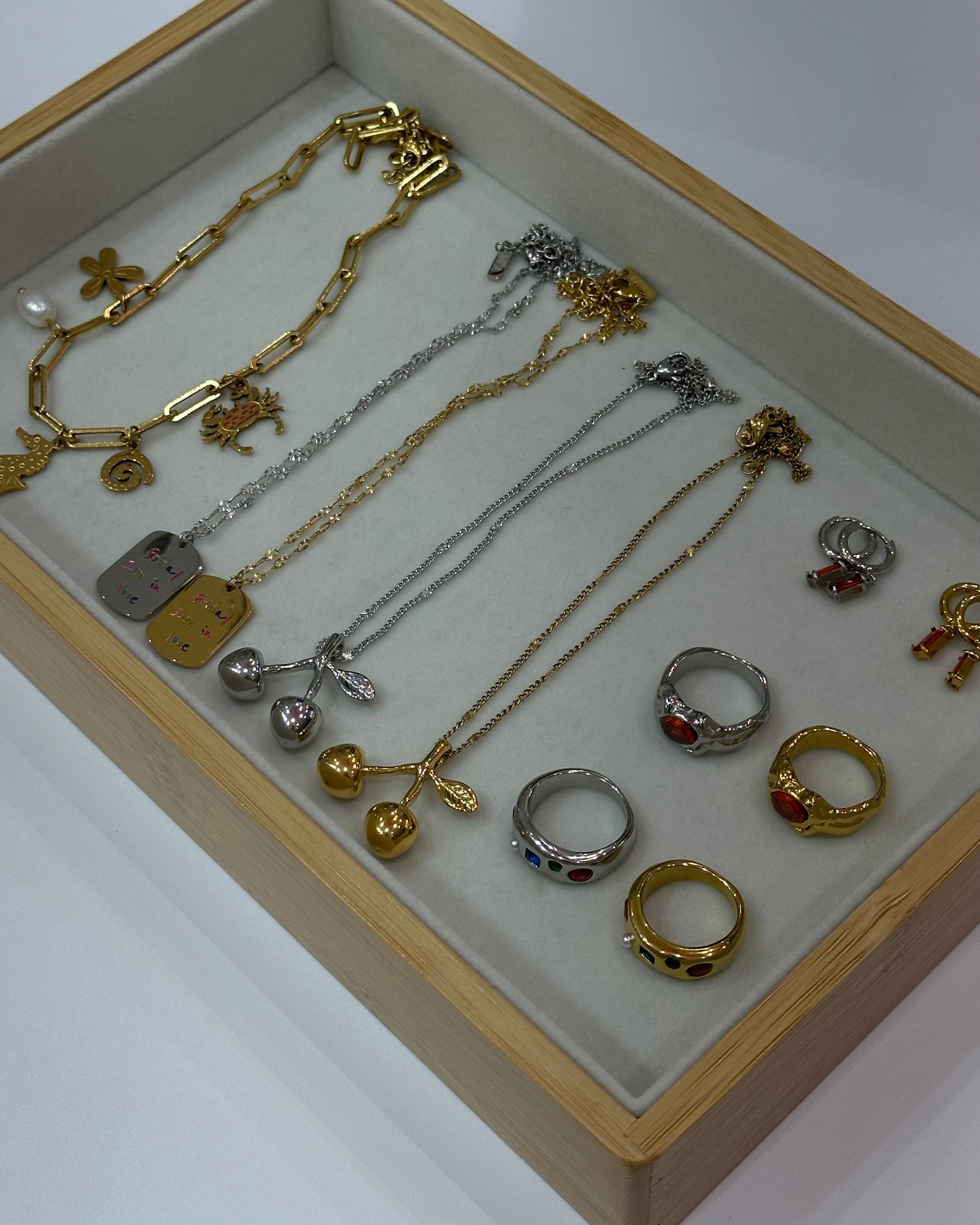 Vous pouvez porter tous nos bijoux dans l'eau et ceux-ci ne vont pas ternir. Pour garder le plaquage or le plus longtemps possible, vous devez éviter tout contact avec les produits chimiques et les surfaces abrasives (frottement). Si le contact avec les produits chimiques est répété ou le frottement excessif, les bijoux perdront leur brillance et cela endommagera sa couche protectrice.