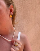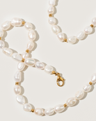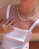 Découvrez le collier Soleil, des perles d'eau douce biologiques, chacune unique, accentuées de délicates perles d'or ou d'argent pour un contraste chaud et ensoleillé. Les formes naturelles et imparfaites le rendent effortless.